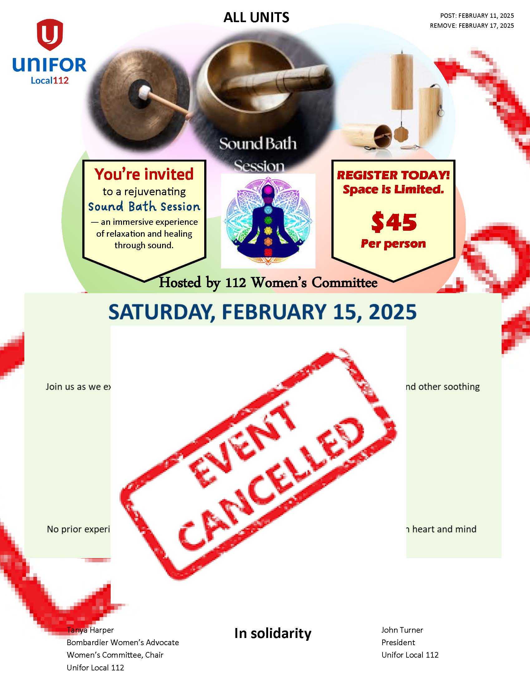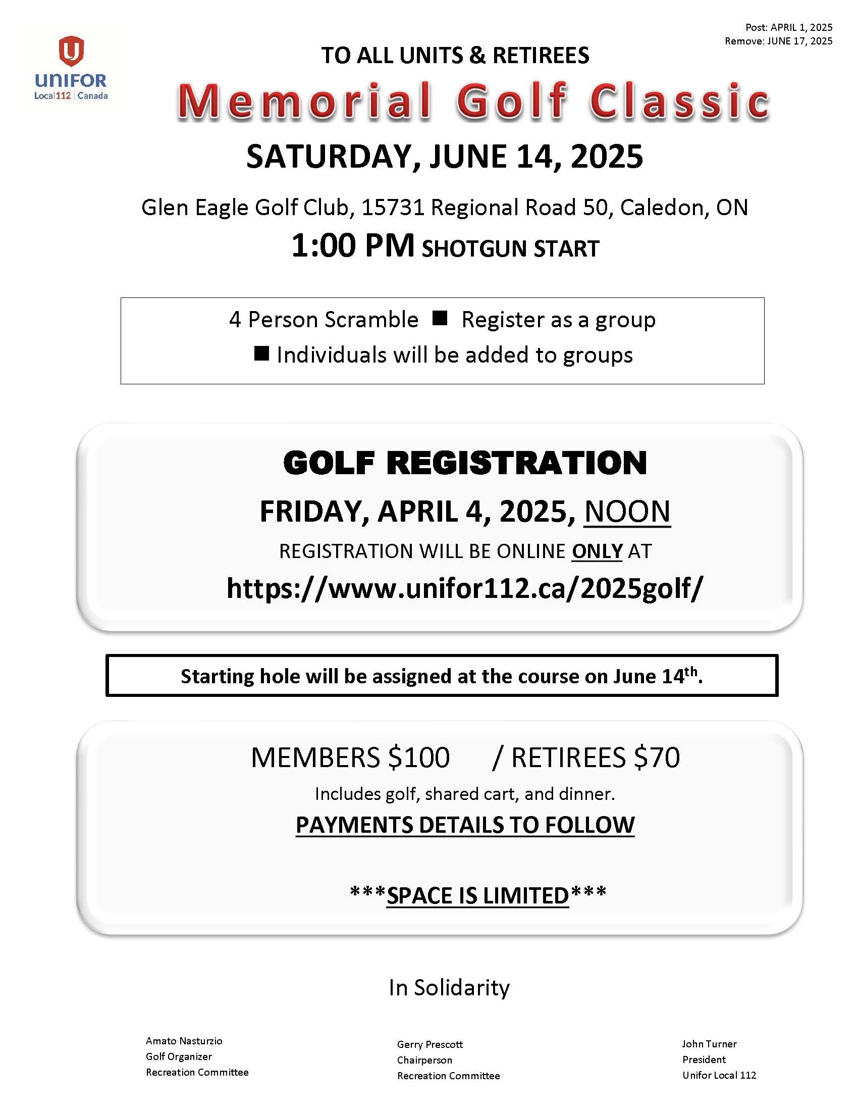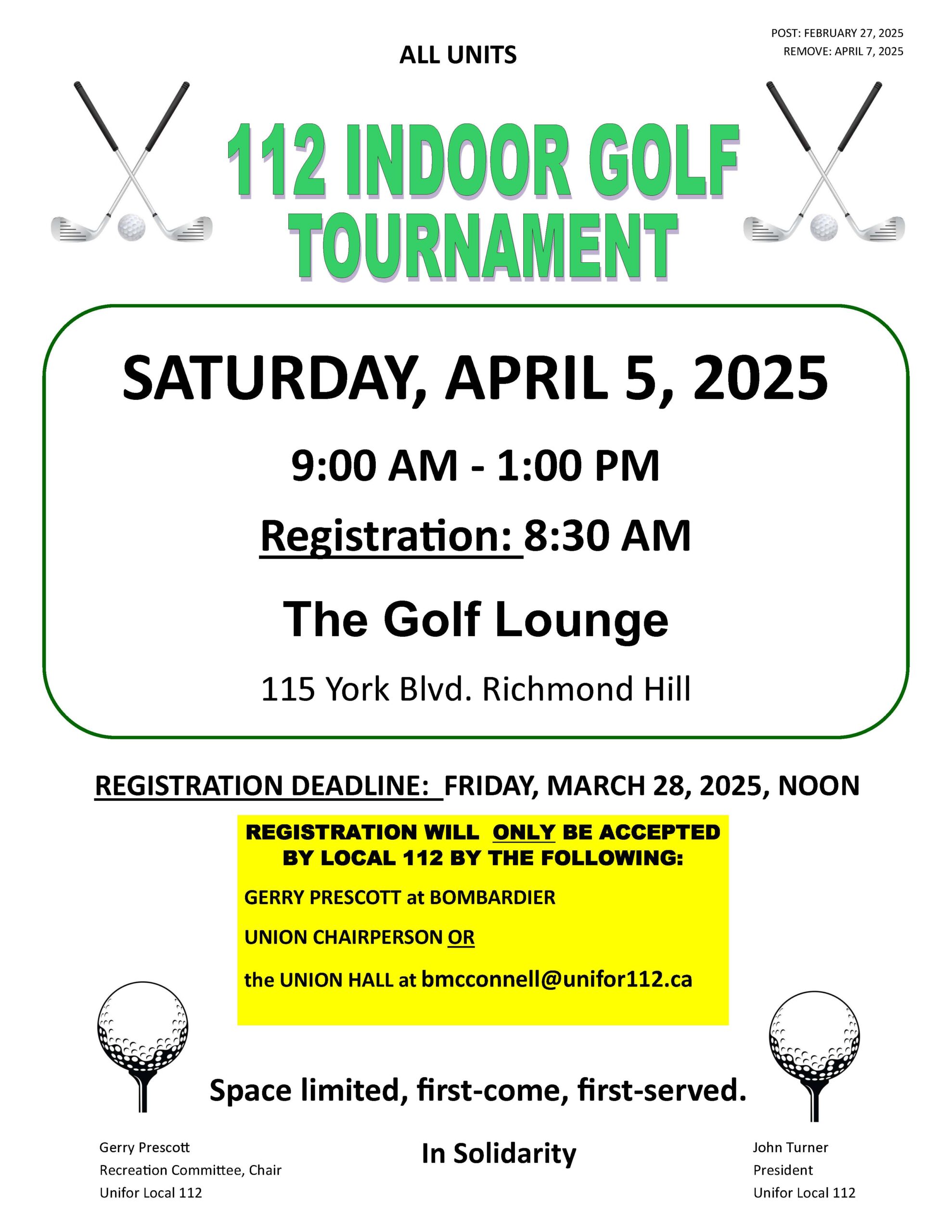AT FULL CAPACITY – EMAIL: bmcconnell@unifor112.ca to be added to a waiting list