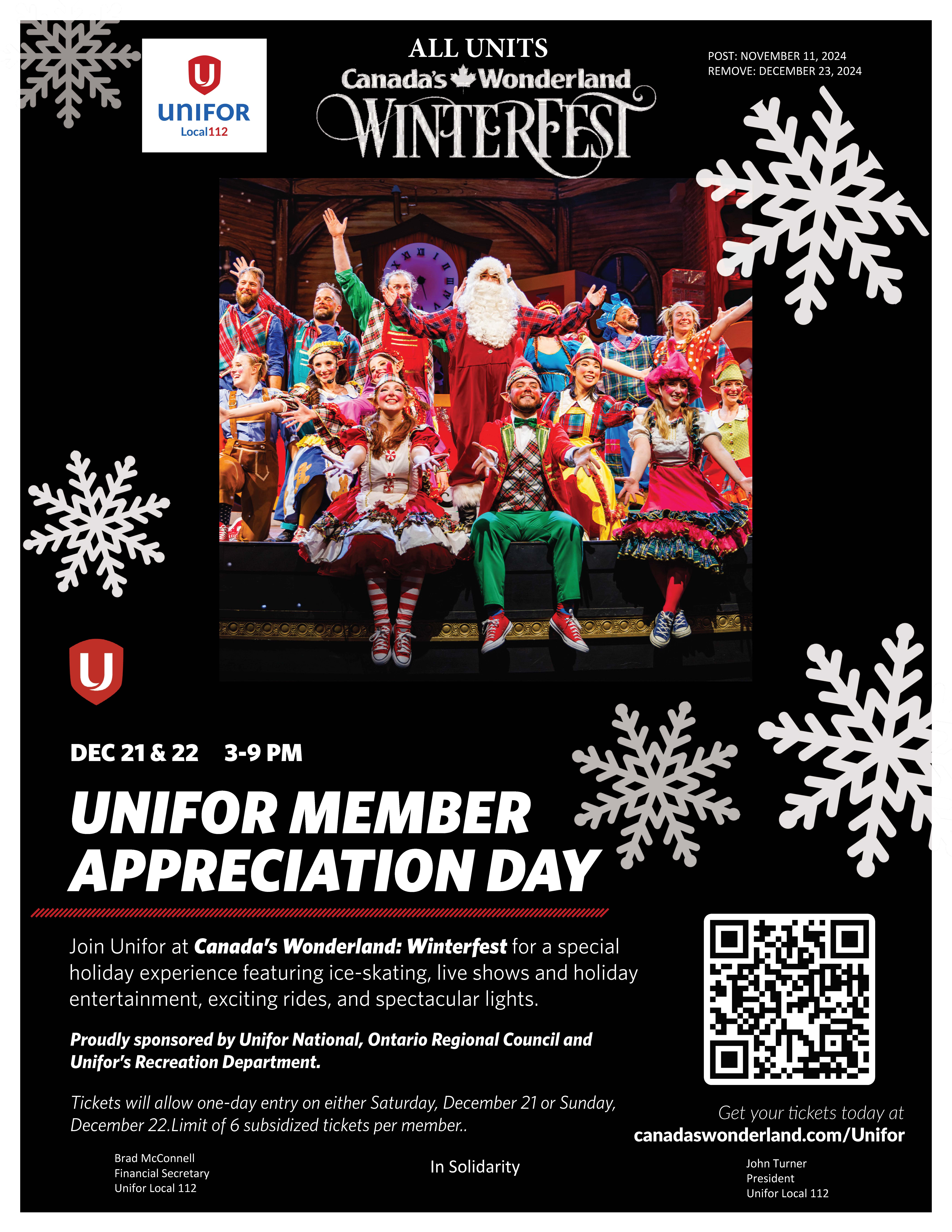 We’re excited to invite you and your loved ones to a special holiday experience at Canada’s Wonderland: Winterfest! This is our way of saying thanks for everything you do to build our union and give us all a time to come together for a festive day filled with joy, solidarity, and holiday spirit.