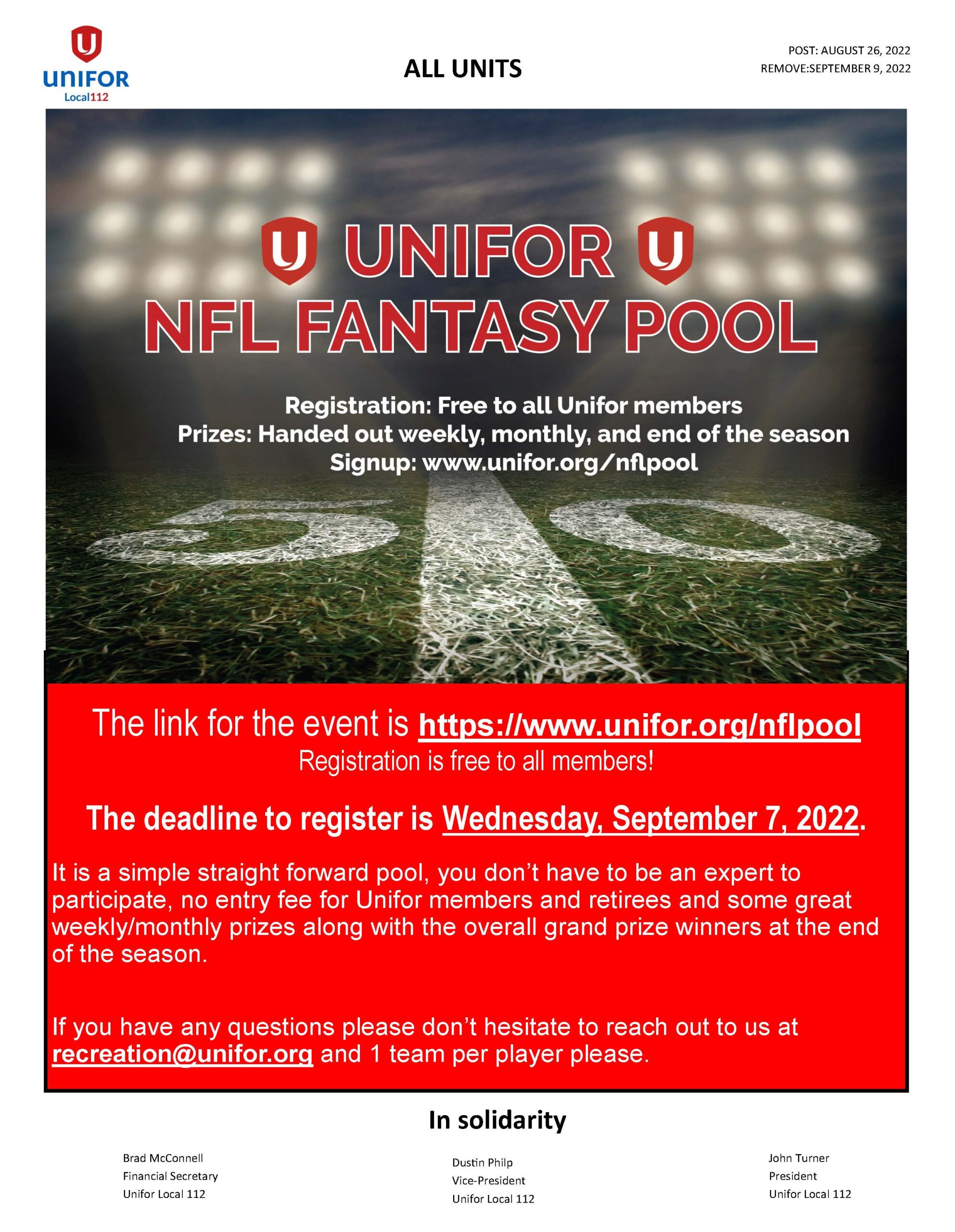 The deadline to register is Wednesday, September 8th and the link for the pool is www.unifor.org/nflpool.