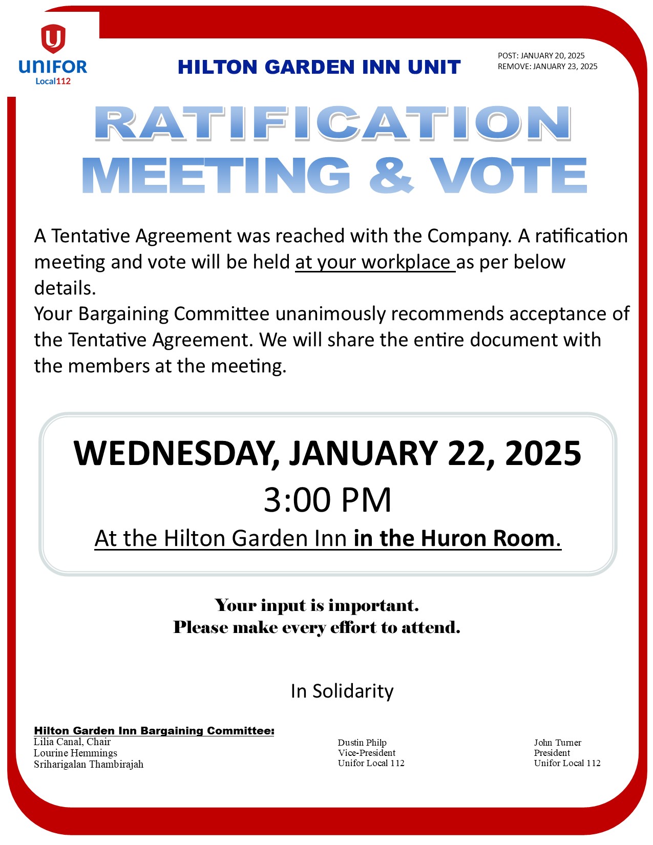 Hilton Garden Inn – RATIFICATION VOTE MEETING Hilton Garden Inn Markham- CBA 2024-2026 Hilton Garden Inn- RATIFICATION VOTE RESULTS