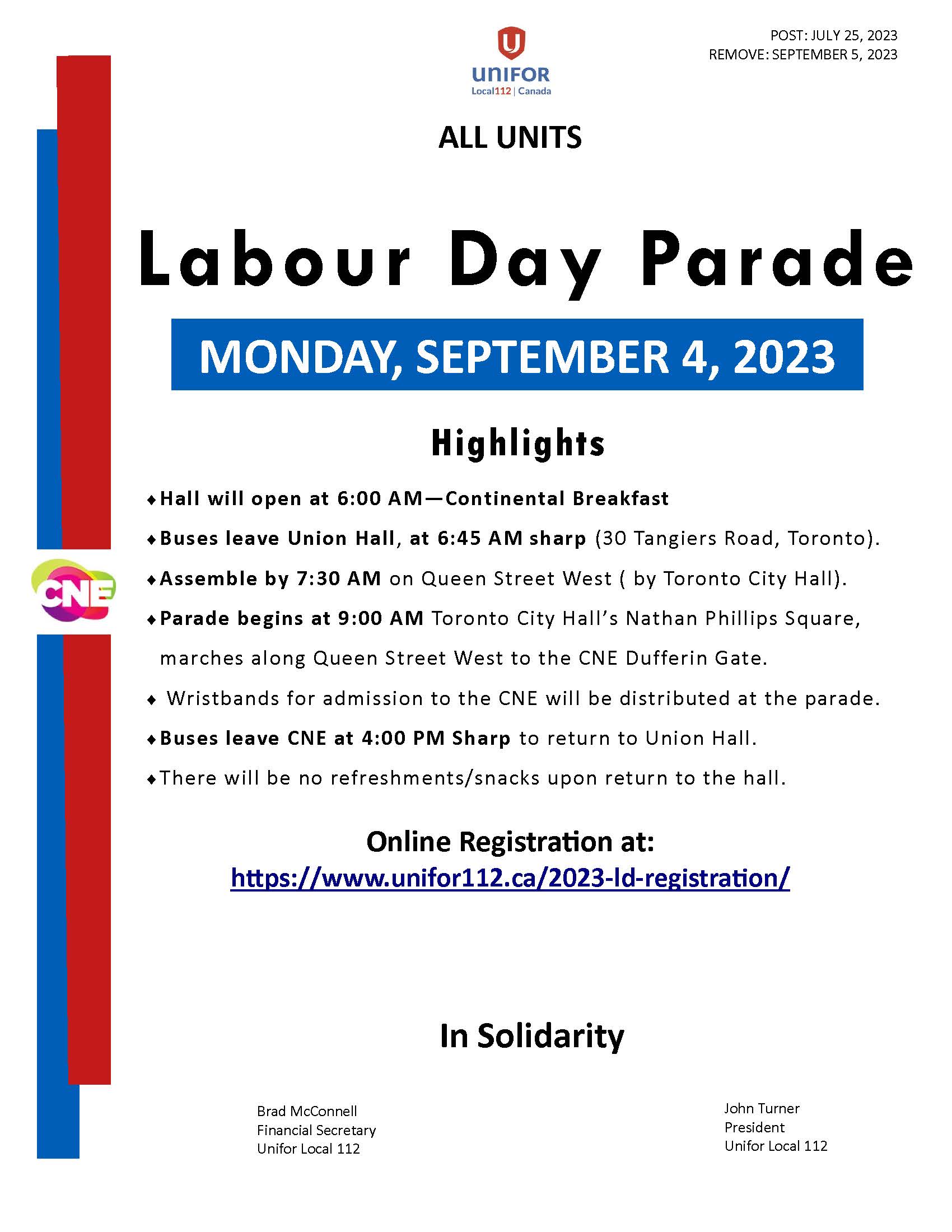 LABOUR DAY PARADE & CNE Online Registration at: https://www.unifor112.ca/2023-ld-registration/ UNIFOR MEMBER APPRECIATION DAY CANCELLATION NOTICE- JULY 2023 GENERAL MEMBERSHIP MEETING