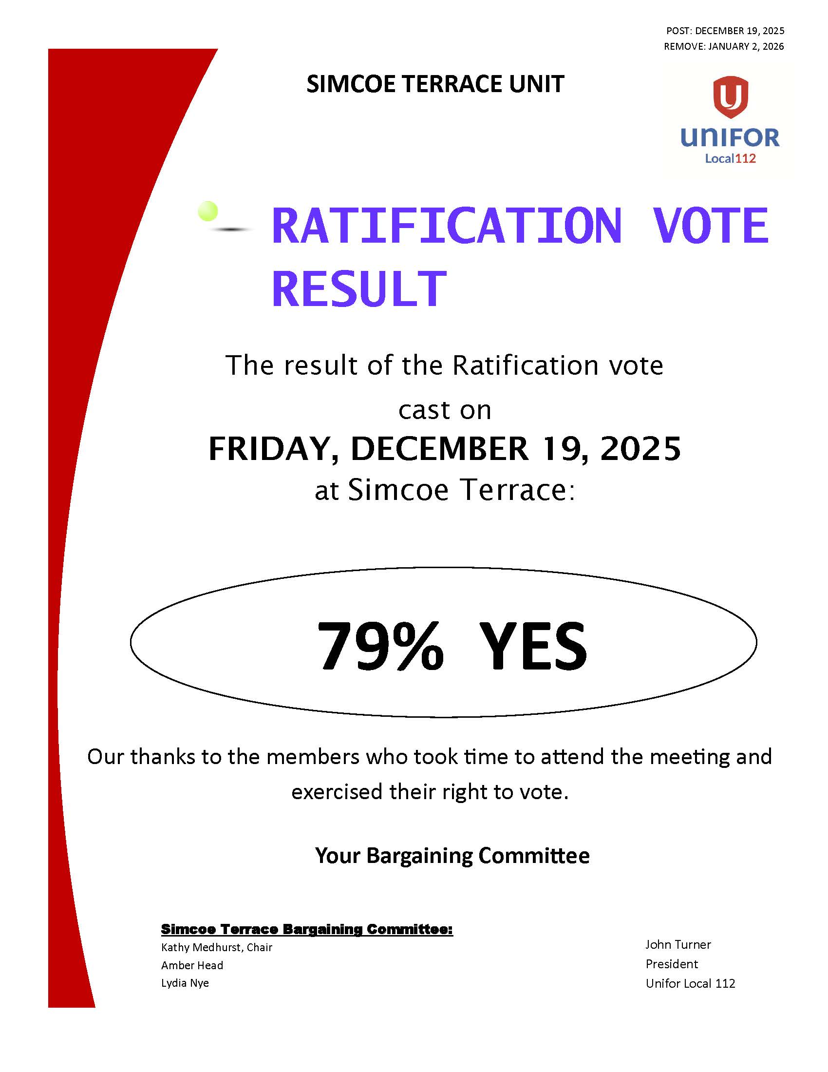 SIMCOE TERRACE RATIFICATION VOTE RESULT